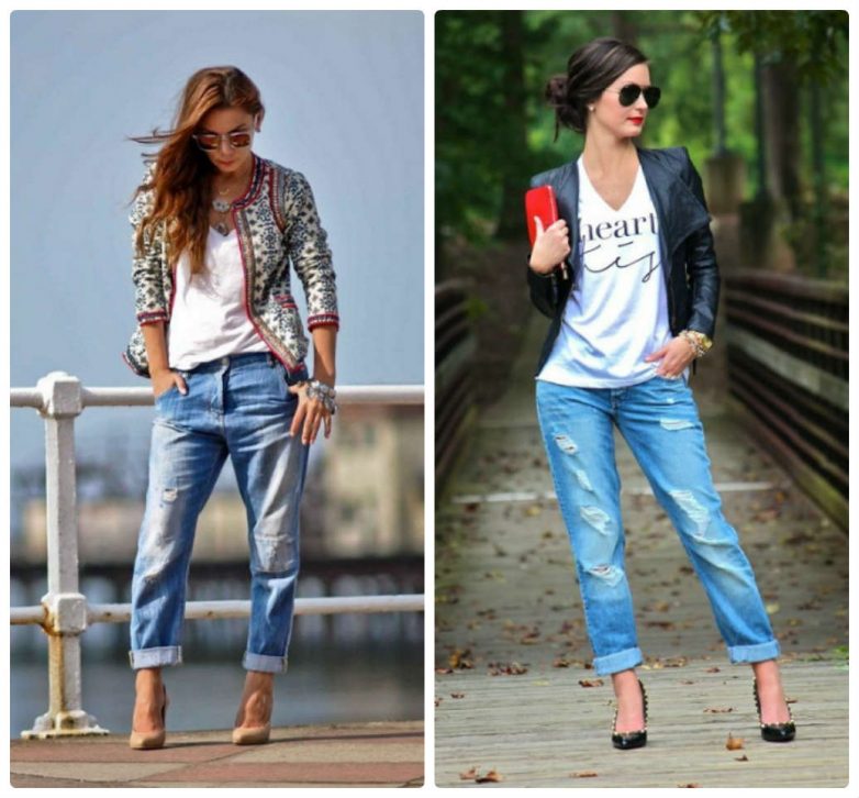 Очень эффектно будут выглядеть модные джинсы-бойфренды. Идеальный дуэт составит такая модель со стильной майкой.