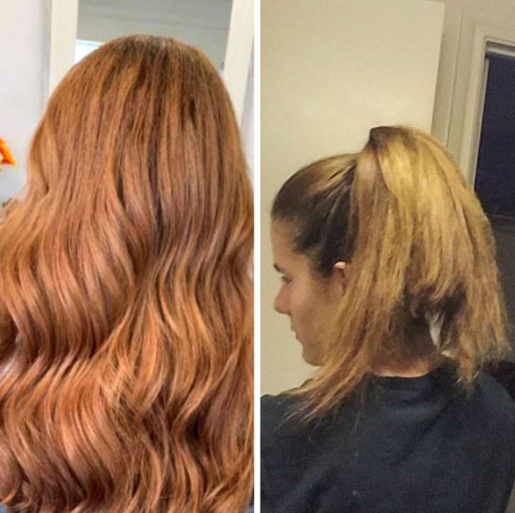 «Первое фото сделал мой парикмахер, когда стрижка была готова. Второе — я сама, когда поняла, что он пытался скрыть с помощью локонов и яркого света»
