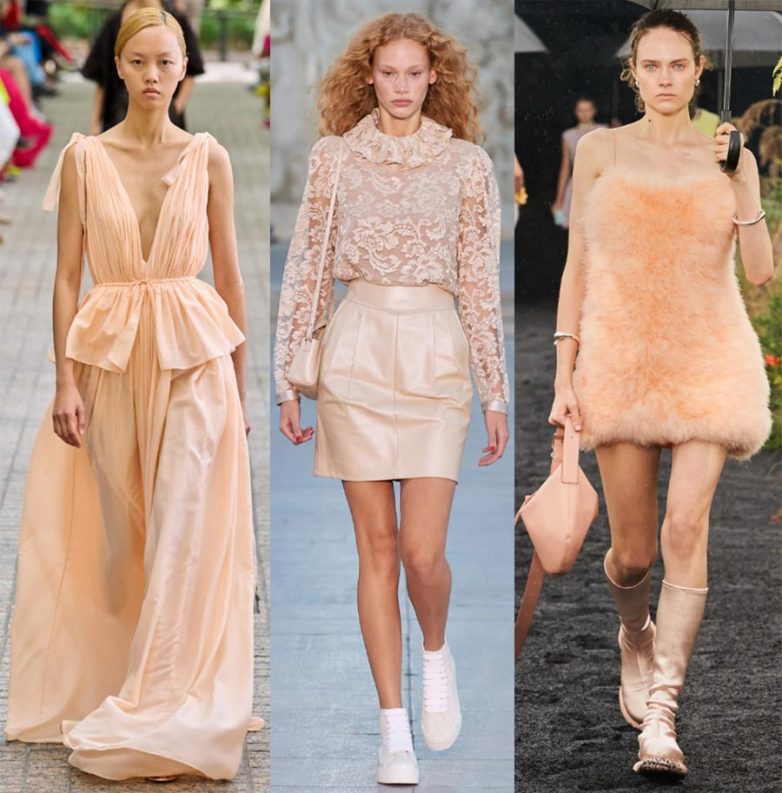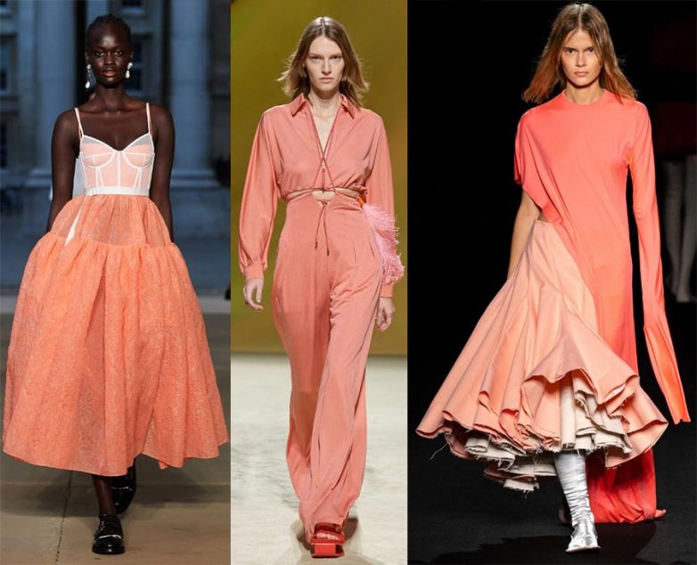Дизайнеры экспериментируют, отшивая из персикового цвета комбинезоны карго, но на каждый день лучше выбрать платье или блузу.