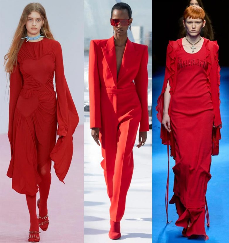 На показах много образов, составленных полностью в красном цвете. Бренд Acne Studios дополняет красное платье колготками в тон.