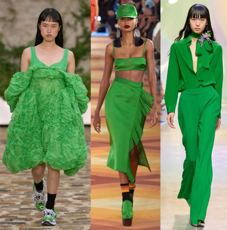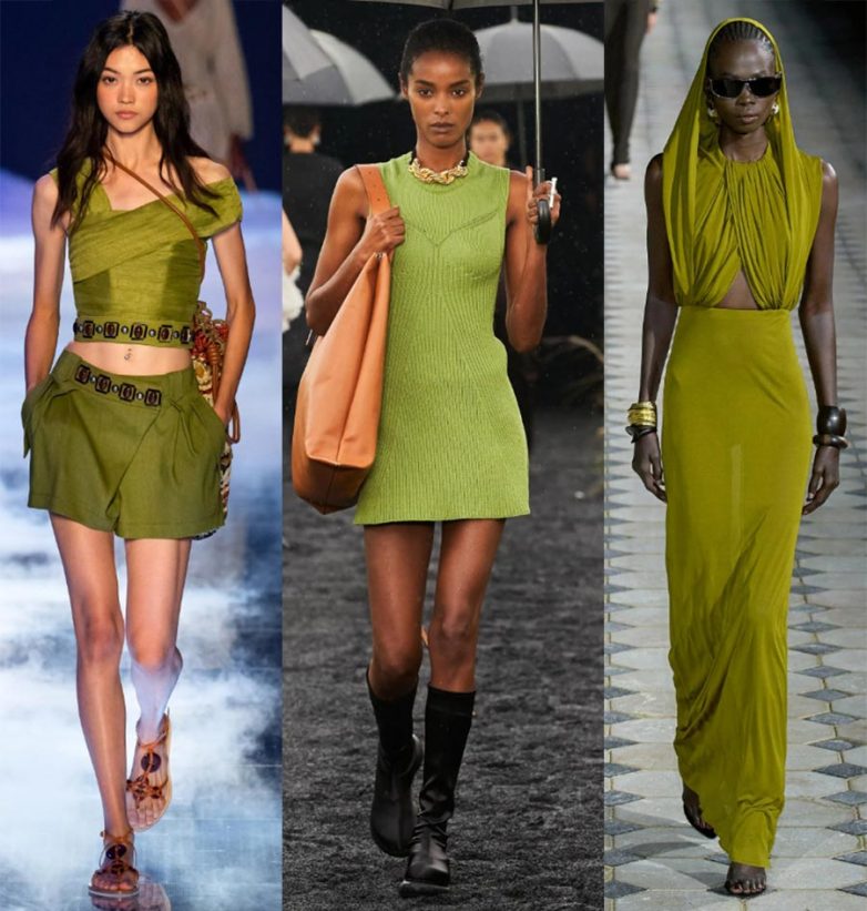Весной и летом 2023 года зеленые платья, костюмы и другую модную одежду сочетайте с белой обувью.