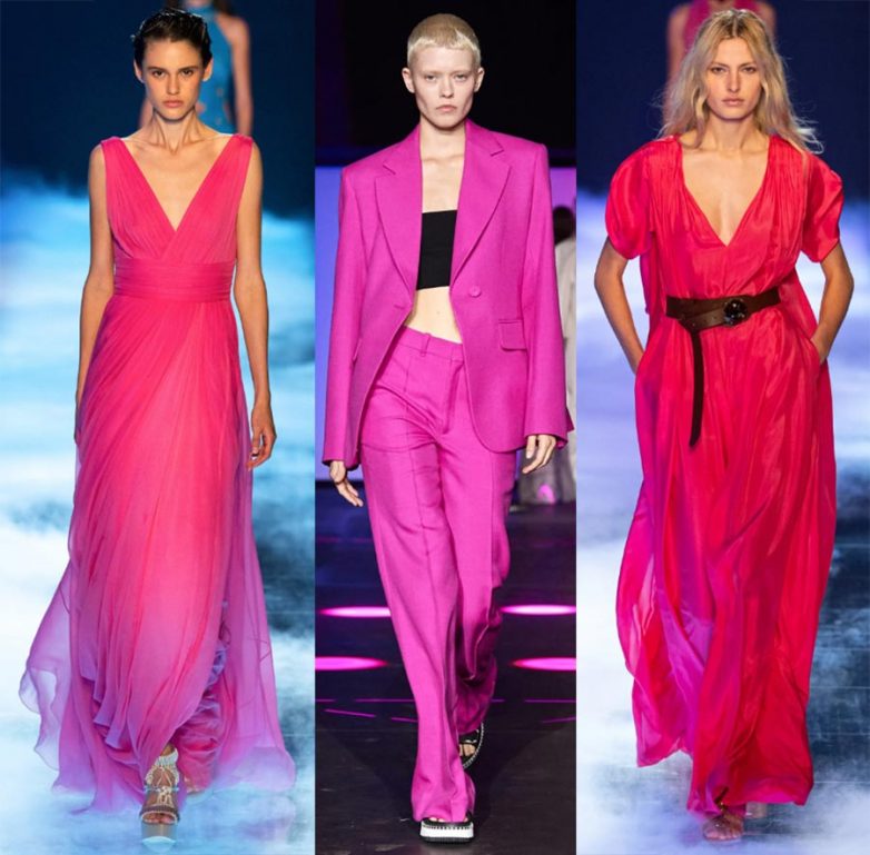 На модных показах много сложной одежды цвета фуксия. Длинные вечерние платья из летящего шифона украшают контрастные ремни и провокационные подплечники (Rick Owens).