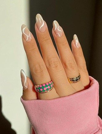 Абстрактные рисунки, линия и формы подойдут для нежного весеннего маникюра, если выбрать правильные оттенки. Нам особенно нравится сочетание белых рисунков с полупрозрачной базой. А если вы предпочитаете цвета поярче, то отдавайте предпочтение малиновому, как на первом фото.