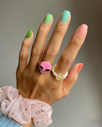 Если из всей пастельной палитры вам сложно выбрать один фаворит, попробуйте выбрать пять лаков и покрыть ногти ими. Комбинации могут быть разными: как сочетание от светлого к темному, так и микс из голубого, розового и салатового. Кроме того, самый легкий способ разнообразить маникюр, если вы делаете его самостоятельно, — прокрасить каждый ноготь разным оттенком.
