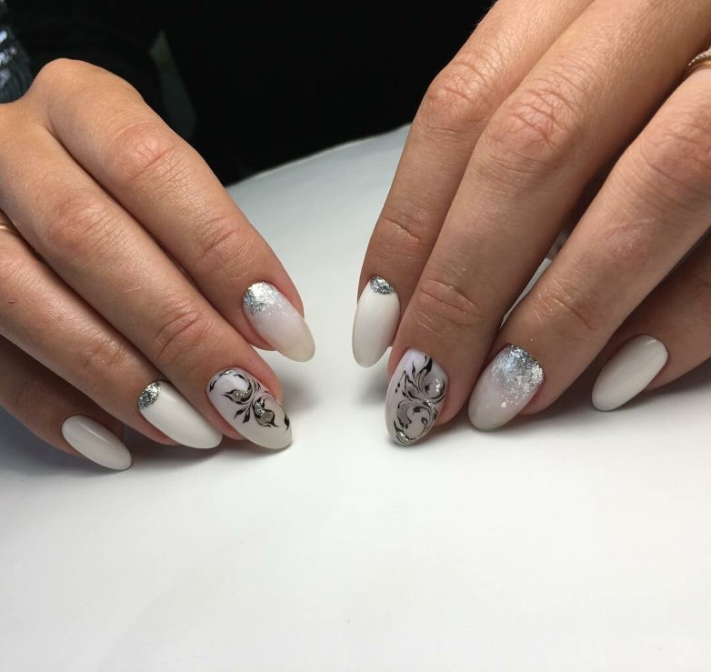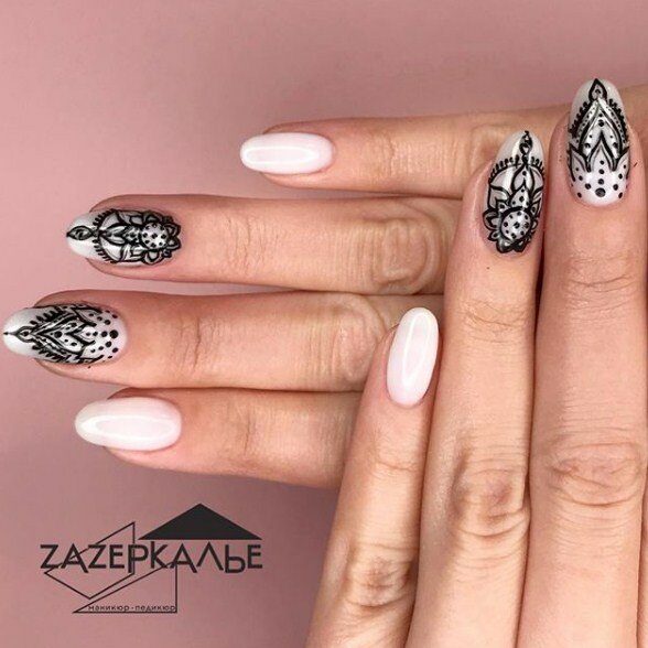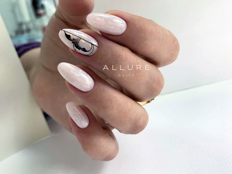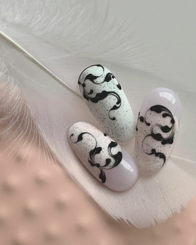 Обычно мастера используют в работе с вензелями акриловые краски черного или белого цвета. Такой выбор основан тем, что традиционные цвета хорошо подходят к любому тону лака. Романтичный маникюр можно создать, используя белый цвет лака, как основной тон, и черные узоры.