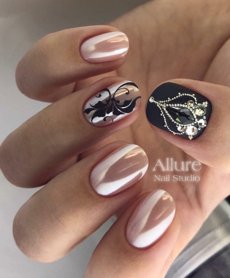 Сияние и блеск в маникюре с вензелями можно добавить при помощи различных страз и блестящих элементов;