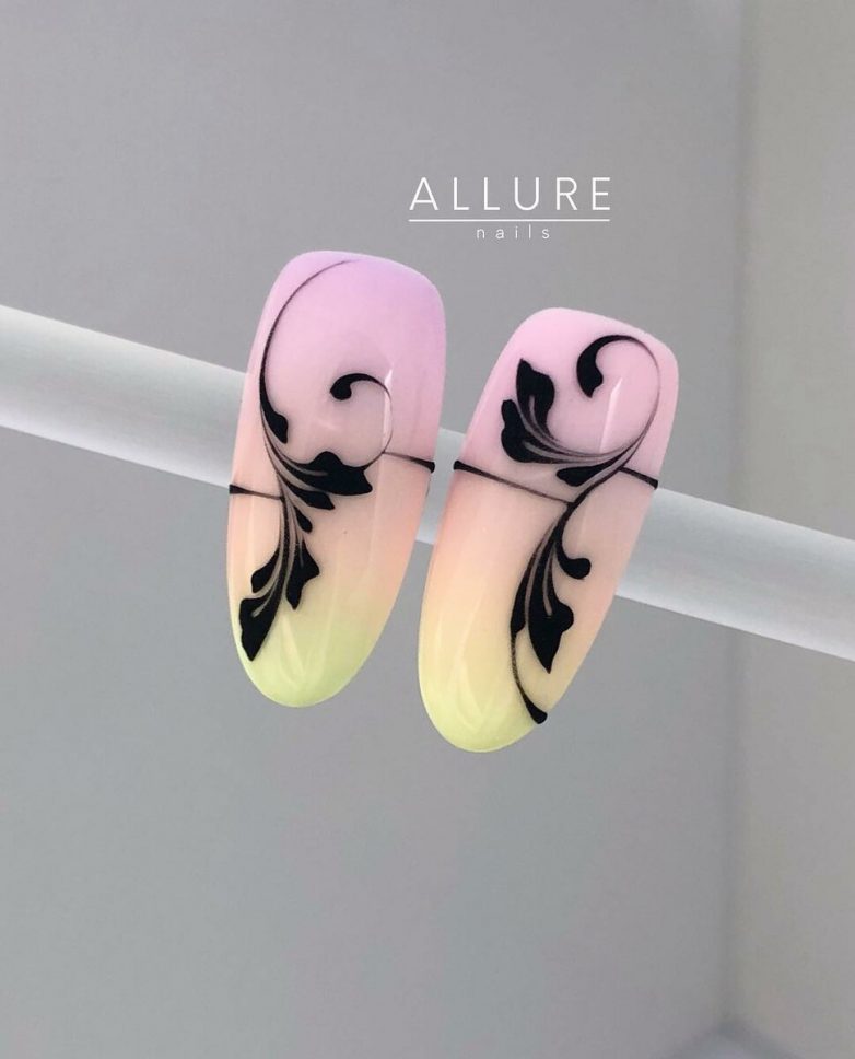 Каждый узор будет уникальным, а значит и маникюр получится очень красивым. На усмотрение клиентки вензеля можно нарисовать на каждом ногте или выделить только два: указательный и большой. Отличным вариантом будет комбинировать различные цвета в узорах.