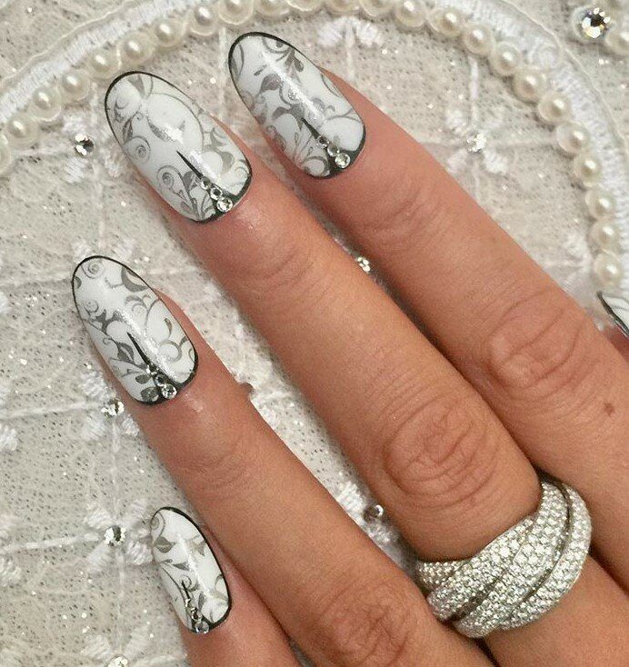 Очень эффектно смотрятся вензеля с выпуклой формой, но такой маникюр подойдет для свадебного торжества.