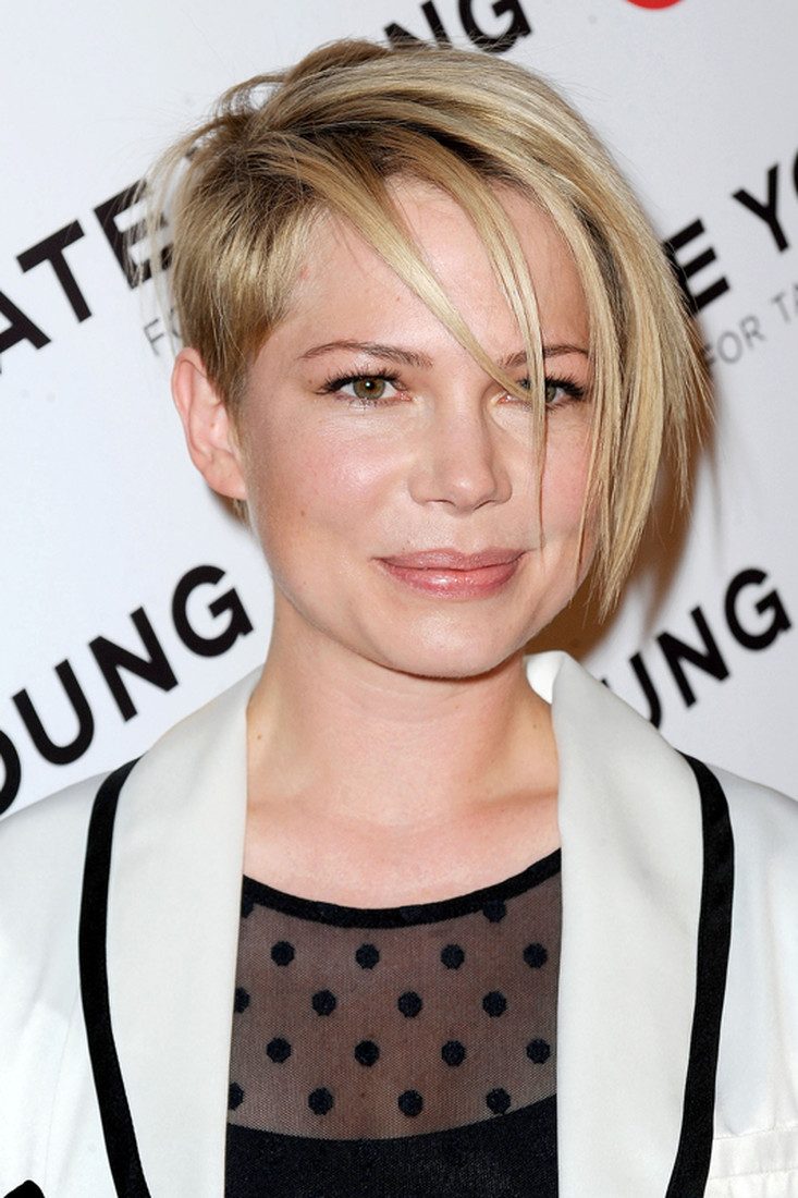 Мишель Уильям сносит классический боковой пикси, эта стрижка проверена временем и всегда остаётся актуальной. При формировании прически используется текструирующий спрей. И высушите их феном с плоской насадкой.