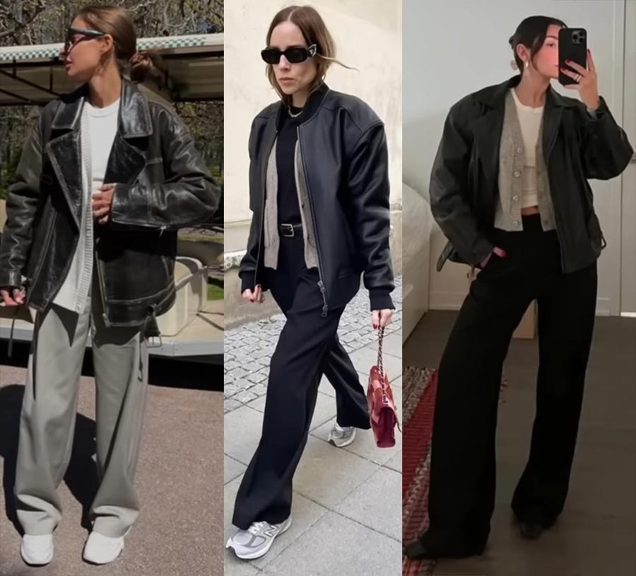 Первая идея: широкие брюки + кроп топ + кардиган + кожаная куртка