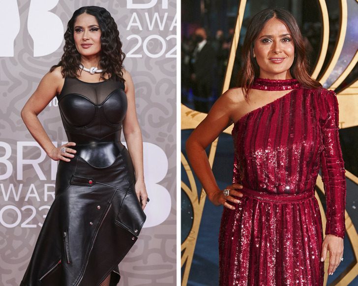 Сальма Хайек невысокого роста — всего 1,57 м. Чтобы сиять на красной дорожке наравне с высокими длинноногими дивами, актриса часто выбирает струящиеся платья в пол. А также предпочитает асимметричные модели, которые визуально вытягивают силуэт.