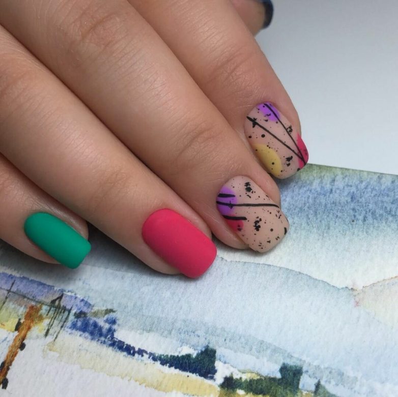 Яркий маникюр указывает на смелую и креативную личность. Просто покрыть ногти красочным лаком – это слишком обыденно, поэтому разнообразить дизайн можно черными брызгами.