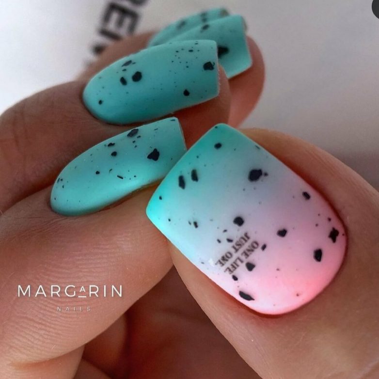 Идеальное решение – это сделать модное омбре и дополнить его брызгами. Такой дизайн еще называют перепелиное яйцо, и пользуется оно большой популярностью.