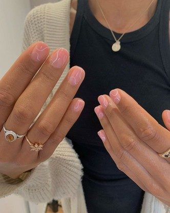 Этот минималистичный дизайн одинаково хорошо выглядит как на длинных, так и на коротких ногтях. Абстрактные, плавные полосы хорошо сочетаются с полупрозрачной нюдовой базой, которая и делает этот маникюр скромным, но элегантным. Для полос можно выбрать любой оттенок лака: от белого до синего или ярко-розового.