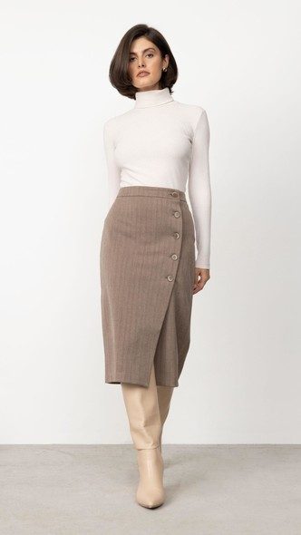 Еще один лайфхак, который позволит визуально подтянуть фигуру и удлинить ноги, — это юбка с вертикальным принтом и завышенной талией. Но есть маленькое «но»: рисунок на изделии должен быть «тихим», например, едва заметная линия или клетка. Не забывайте, что материал тоже имеет значение, поэтому выбирайте юбки из плотных тканей, которые не позволят растянуть принт на бедрах.
