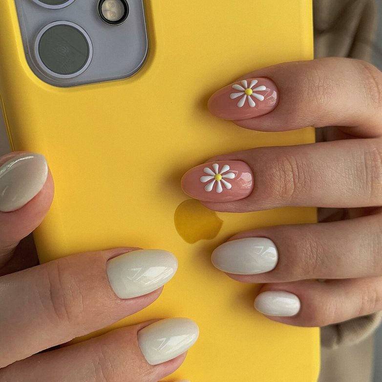 Флористическая тематика в строгом образе всегда уместна, если выполнена лаконично и без излишнего декора. Бело-черные варианты маникюра с миниатюрными цветочками и веточками смотрятся женственно и эффектно. Отлично выглядит нежно-сиреневый маникюр с нежными кремовыми подснежниками.