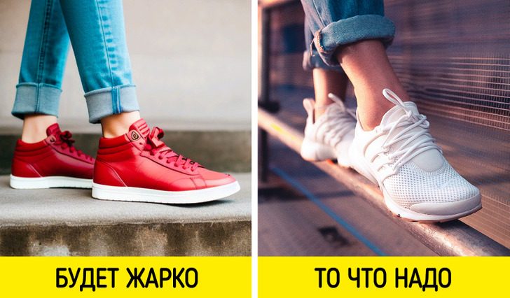 В жару в кожаной обуви можно ненароком вспотеть. Эксперты рекомендуют при высокой температуре воздуха надевать кроссовки из так называемых дышащих материалов, например из текстиля.