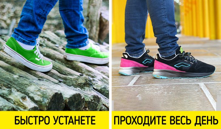 Кроссовки могут быть впритык и мешать нормально передвигаться, если, например, вы вложите в них толстую стельку или наденете хлопковые носки. Поэтому стоит выбирать такие модели, которые будут сидеть чуть свободнее, чем ваша обычная обувь. Такие кроссовки также будут способствовать циркуляции воздуха, и ноги не вспотеют. Хороший лайфхак — мерить обувь вечером и на носок.