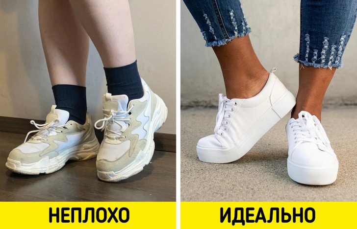 Носить некоторые модели обуви на босую ногу, конечно же, совсем неудобно. Но чем больше видно носки, тем более приземисто выглядит образ. И, как следствие, мы выглядим старше своих лет. В таких случаях можно носить очень низкие носки или вовсе заменить их капроновыми следками, которые не будут выглядывать из обуви.