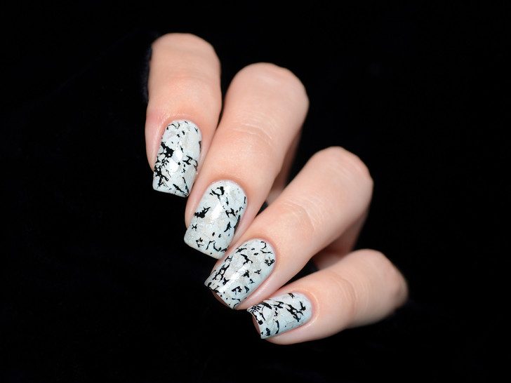 Если ваш выбор — не яркий, а более сглаженный по цветам маникюр, мраморный принт будет как никогда кстати. Не стоит наносить его на все ногти — лучше выбрать один или два на каждой руке, тогда маникюр будет выглядеть стильно. Выбирайте монохромные цвета: белый, серый, черный.