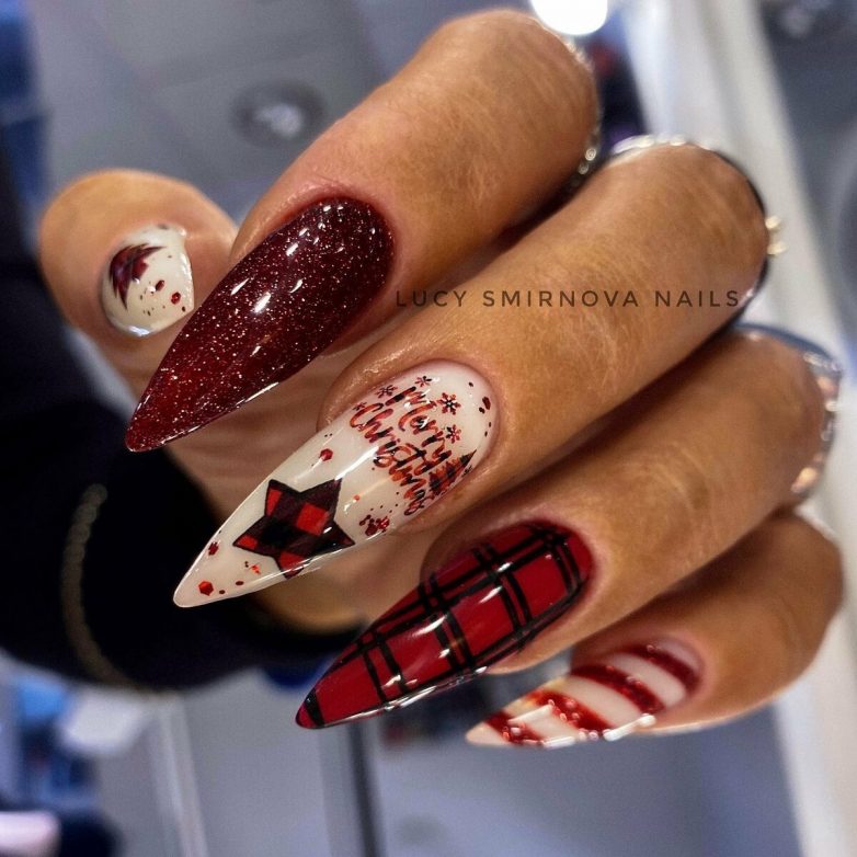 Если вы любительница экстравагантных образов, красный блестящий маникюр — ваш идеальный вариант. К основному цвету можно добавить белые элементы. Этот прием немного смягчит краски и сделает маникюр менее броским.