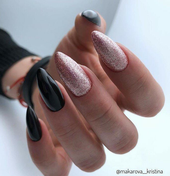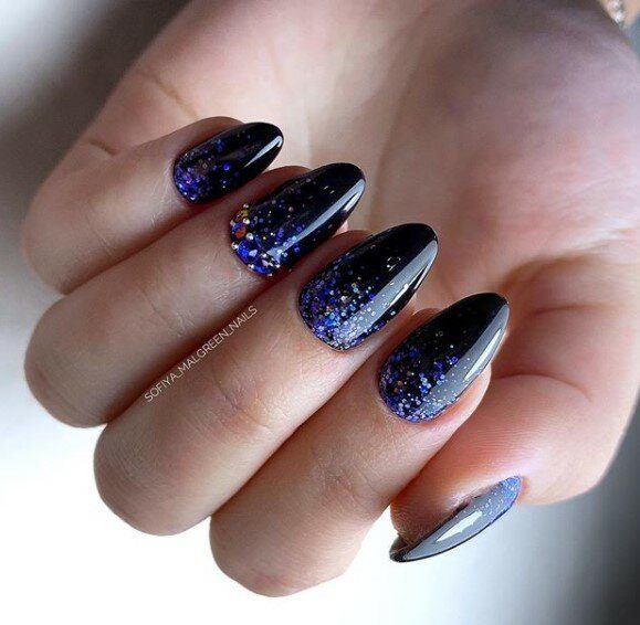 Для похода на вечеринку отличным украшением послужит черный маникюр с блестками. Ноготки можно покрыть черным лаком, посыпать золотыми блестками и зафиксировать топовым покрытием. Или вы можете воспользоваться бесцветным лаком с блестками.