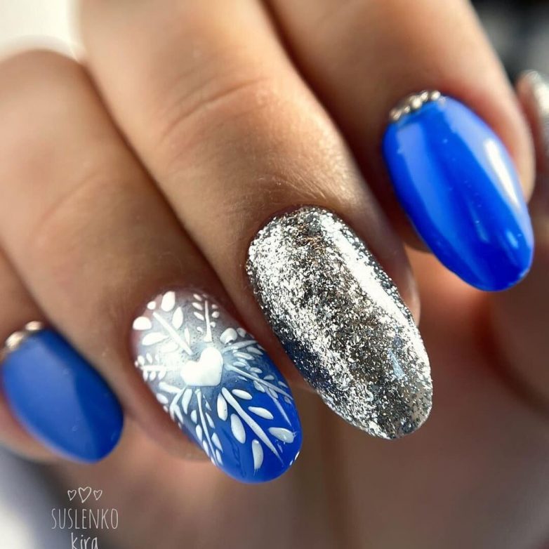 Синий маникюр часто используется женщинами создания образов новогодней тематики. Синий или голубой основной цвет, покрытый блестками напоминает искрящийся на солнце снег. Поэтому он больше подходит для зимнего периода.