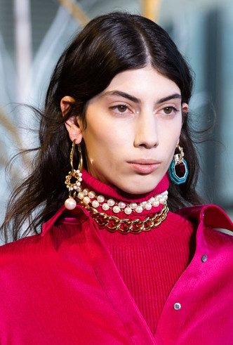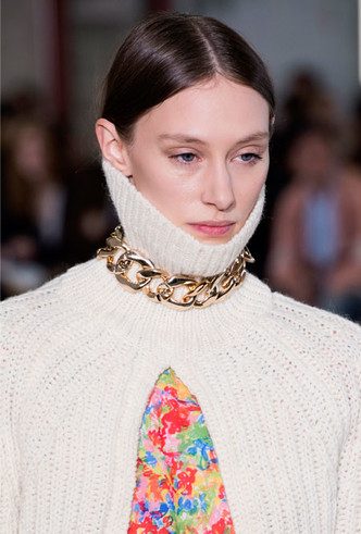 Мастхэв наступающего сезона — гипертрофированно огромные ожерелья-цепи, как на показе JW Anderson. Причем чем крупнее и больше звенья, тем лучше. Самый стильный вариант стилизации — поверх водолазки или свитера крупной вязки с высоким воротником — так, чтобы цепь была в центре внимания. Ориентиры можно найти в фотоотчетах Adeam, Aalto и Jean Paul Gaultier.