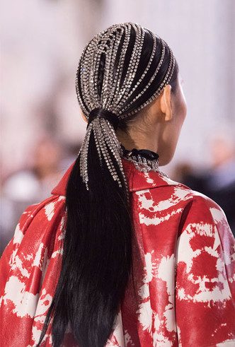 Настоящий фурор произвели цепочки из страз и переливающихся камней с показа, вплетенные в волосы — выглядит свежо, а сама укладка не займет много времени. Никто не запрещал нам провернуть тот же фокус с цепями — например, закрепить их у основания хвоста. Похожий вариант мы заприметили на показе Balmain: здесь Оливье Рустен использует массивные цепи вместо ободка, создавая более брутальный вариант диадемы.