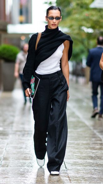 Еще один модный образ показали Аманда Сейфрид и Белла Хадид. Девушки выбрали для выхода широкие костюмные брюки с защипами, но дополнили его разным верхом. Так можете сделать и вы, опираясь на распорядок дня. Если никаких деловых встреч не назначено, повторите выход топ-модели Беллы Хадид и дополните аутфит лаконичным топом.