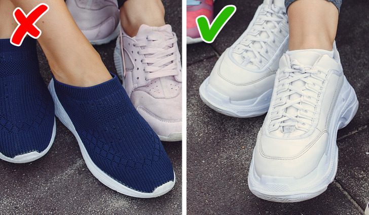 Кеды или кроссовки на шнуровке предпочтительнее балеток и слипонов, потому что они обеспечивают лучшую поддержку. Многие знают, что тугая обувь может навредить здоровью ног, но ношение слишком свободной обуви вредит не меньше. В меру затянутые шнурки мягко удержат ногу на месте и не позволят ей соскальзывать и болтаться.