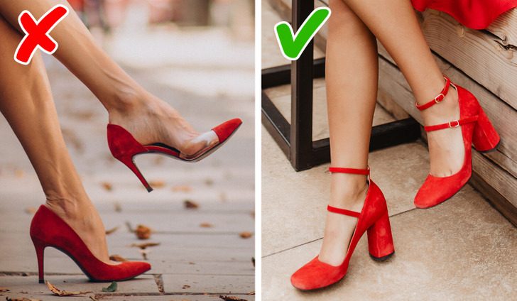 У туфель на высоком каблуке и так имеется множество недостатков: они создают напряжение в нижней части спины, коленях, икроножных мышцах и так далее. Чтобы не усугублять количество проблем, обращайте внимание на носок закрытых туфель. Лучше, чтобы он был широким и пальцы в нем располагались довольно свободно и не были зажаты. Между мальцами ног и носком в идеале должен быть зазор не менее сантиметра.