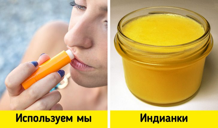 С давних времен жители Индии используют топленое масло в приготовлении пищи. Но оно также является отличным увлажняющим средством. Индианки применяют его вместо масел для тела и кремов, а также при лечении обветренных и потрескавшихся губ.