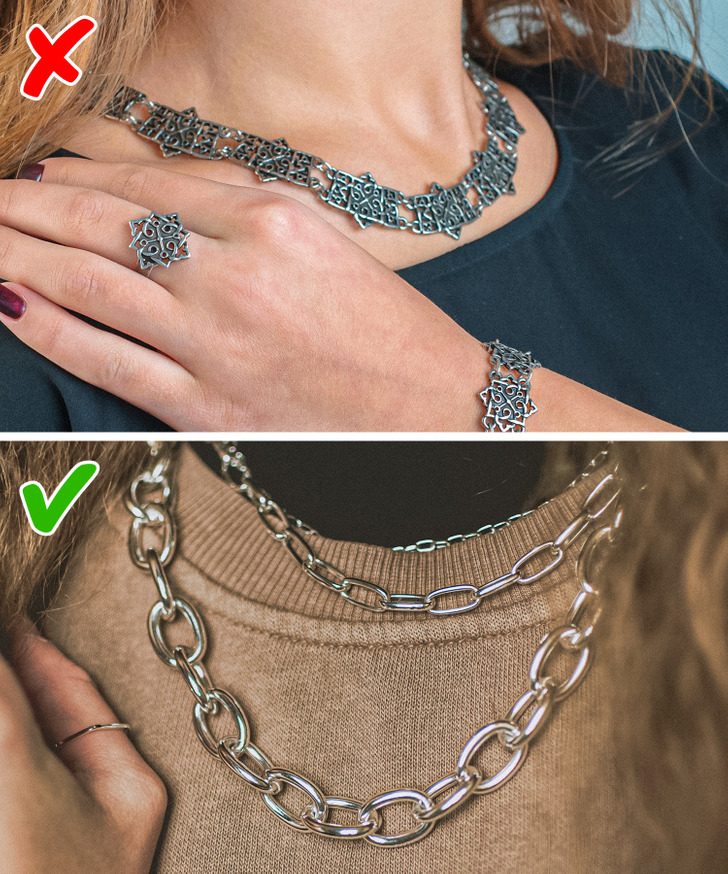 Правило, диктующее запрет на ношение серебра с золотом, уже устарело. Сегодня можно спокойно экспериментировать, смешивая различные драгоценные металлы. Не стоит забывать о балансе: размер, тематика, общий оттенок металлов. Например, при наслоении цепочек стоит выбирать цепи разной длины, чтобы они не спутывались.