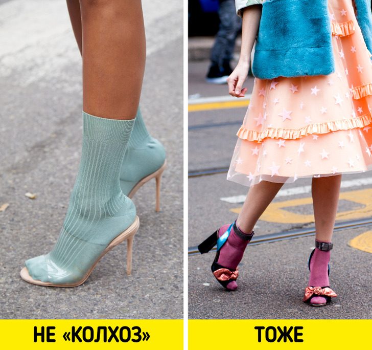 Правило, что хлопковые носки не сочетаются с изящными босоножками уже давно морально устарело и его можно смело нарушать. Обувь с открытым носом в сочетании с яркими и не очень носками уже давно мелькает на модных подиумах. К тому же с носками вы точно не натрете ноги.
