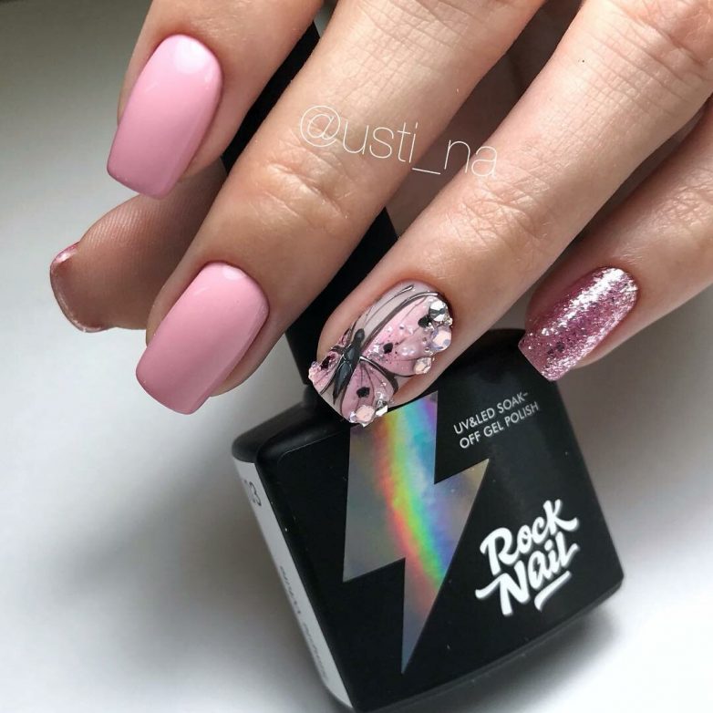 Замечательное решение – это дополнить нежный пудровый маникюр креативным рисунком. Но важно, чтобы акцент не испортил всей роскоши и красоты стильного дизайна. Мастера советуют выбирать бабочек, которые лучше всего подчеркивают элегантность пудрового маникюра.