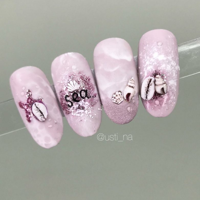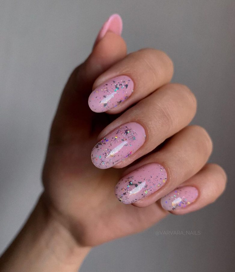 Для создания интересного маникюра для особенных случаев можно в пудровый общий тон добавить несколько блестящих камушков или разнообразить дизайн разноцветным глиттером. Но не переборщите со сверкающими деталями, пудровый маникюр выглядит симпатично как раз в лаконичном стиле.