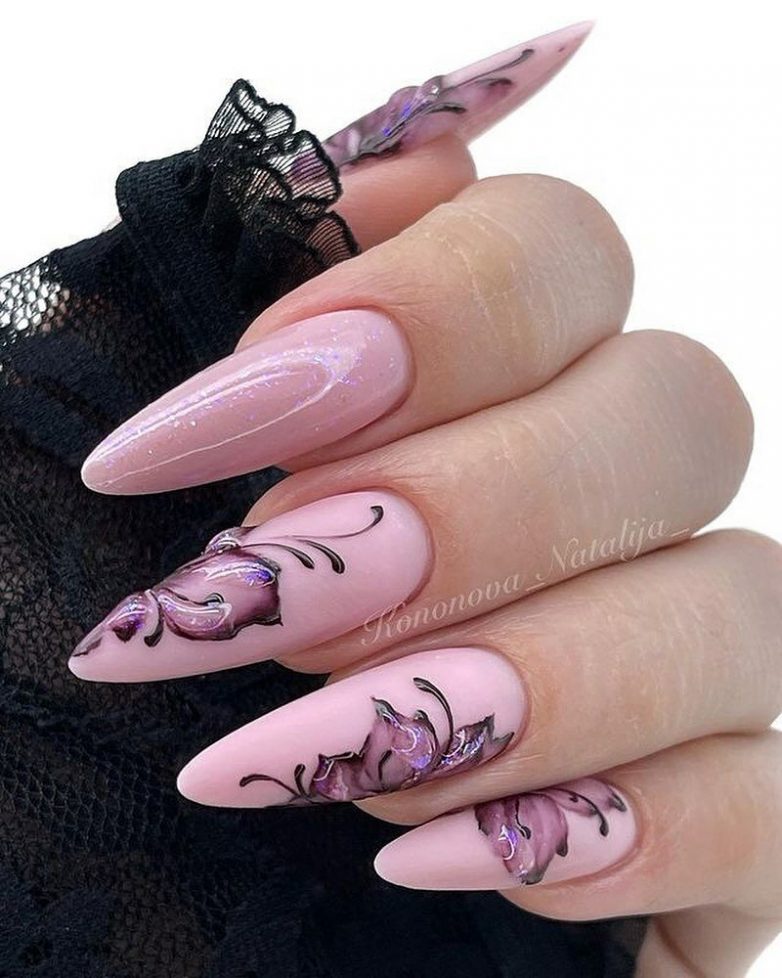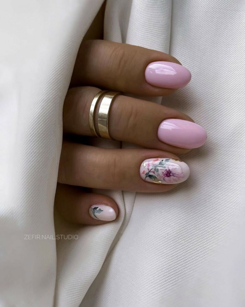 Пудровый цвет ассоциируется с благоухающими розами, неудивительно, что к такому маникюру часто выбирают рисунки красивых букетов и одиночных цветов. Старайтесь выбирать одну палитру оттенков, здесь не нужны яркие акценты и сложные прорисовки деталей.