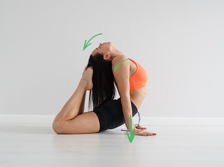 Взгляд должен быть устремлен назад, голова направляется к ногам с вытянутым подбородком.