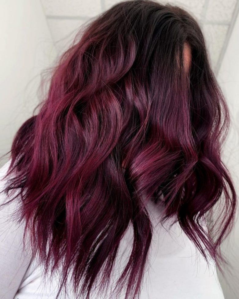 Цвет бургундского вина, сочетаемый с нежным фиолетовым, создает необычное, но привлекательное сочетание, которое завораживает взгляды. Чудесное решение для черных волос!