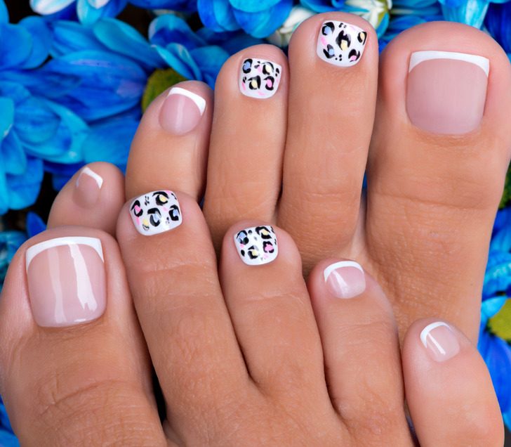 Французский педикюр и маникюр вернулся в тренды. В сочетании с анималистичным принтом педикюр получится особенно эффектным