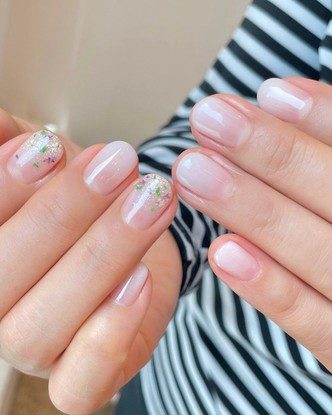 Предупреждаем, что на такой маникюр можно надолго залипнуть, ведь сухоцветы, залитые прозрачным лаком, хочется рассматривать бесконечно. Они делают маникюр нежным и очень женственным, особенно, если сочетать сухоцветы с нюдовым покрытием и таким же утонченным дизайном. Комбинировать нейл-арт можно с разводами, мелкими блестками и легким градиентом.