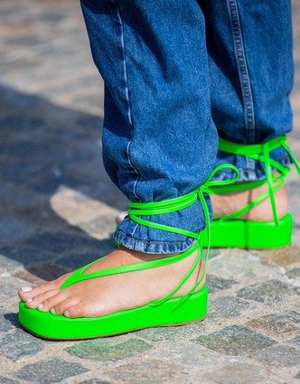 Неоновые цвета актуальны только на туфлях и босоножках, броские же сандалии будут выглядеть старомодно и напоминать 2010-е годы. Более того, такую обувь сложно вписать в летний гардероб, когда ваша одежда становится яркой и пестрой.