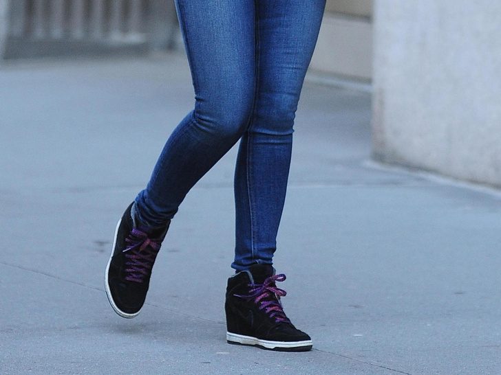 Это безвкусное сочетание часто присутствует в женских образах, и смотрится оно так же неорганично, будь на их месте массивная обувь. Скинни подразумевают вслед за собой элегантное продолжение, поэтому дополняйте их аккуратными кедами на небольшой платформе, верхний материал которых выполнен из кожи. Такие модели можно смело носить и с платьями, поэтому они станут универсальной парой в вашем гардеробе. А вот от тряпочных кед в такой комбинации предлагаем отказаться — они упростят образ.