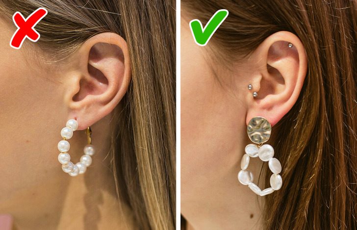 Напротив, серьги-гвоздики и очки не очень хорошо смотрятся вместе. Они создают ощущение перегруженности, поскольку оба аксессуара акцентируют внимание на области ушей и глаз.