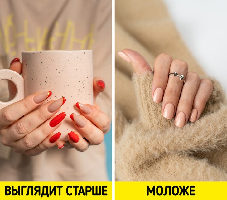 Короткие ногти подсознательно ассоциируются у людей с юностью. А вот из-за слишком длинных ногтей руки выглядят «возрастными». Если хочется визуально сбросить пару лет, стоит отказаться от наращивания, укоротить ногти и отдавать предпочтение аккуратному маникюру.