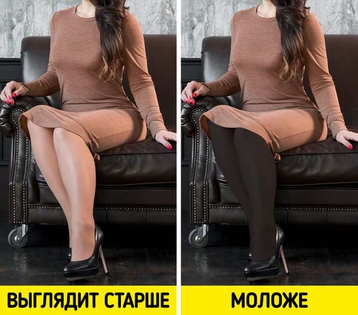 Стилисты утверждают, что телесные колготки, особенно блестящие, старят любую женщину. Они не скрывают недостатки кожи и неизбежные возрастные изменения, не делают ноги более загорелыми или стройными. Зато накидывают пару лет.