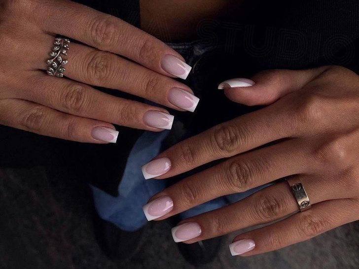 Классический французский маникюр, особенно на ногтях квадратной формы, уже вышел из моды и не сделает вас моложе. Вместо него лучше отдать предпочтение нюдовому покрытию или микро-френчу, чья особенность в более тонкой линии по свободному краю. Такой френч еще долго будет в моде и выглядит гораздо женственнее, чем классический французский маникюр.