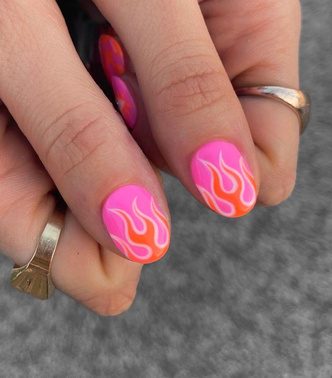 В этом дизайне розовый может быть как основой для дизайна, так и цветом, которым мастер прорисует дизайн. Лак можно сочетать с красными и оранжевыми оттенками. Если вам не по душе яркие нейл-арты, попробуйте нарисовать узор только на больших пальцах или на безымянном. Так вы сделаете один акцент, который не будет выглядеть слишком вычурно.