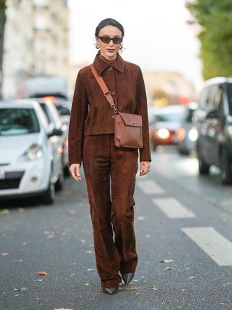 Чтобы избежать скучных образов, не забывайте про акценты — крупные украшения или минималистичные скульптурные формы в золоте. Благородный коричневый или глубокий карамельный идеально сочетаются с голубым и белым, поэтому освежайте многослойные аутфиты элементами холодных оттенов.